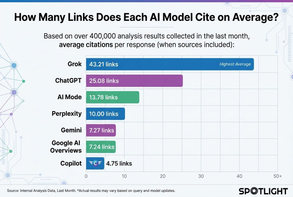 Based on data from over 400,000 analysis results collected in the last month, here’s how many links each AI model cites per response – when it includes sources: